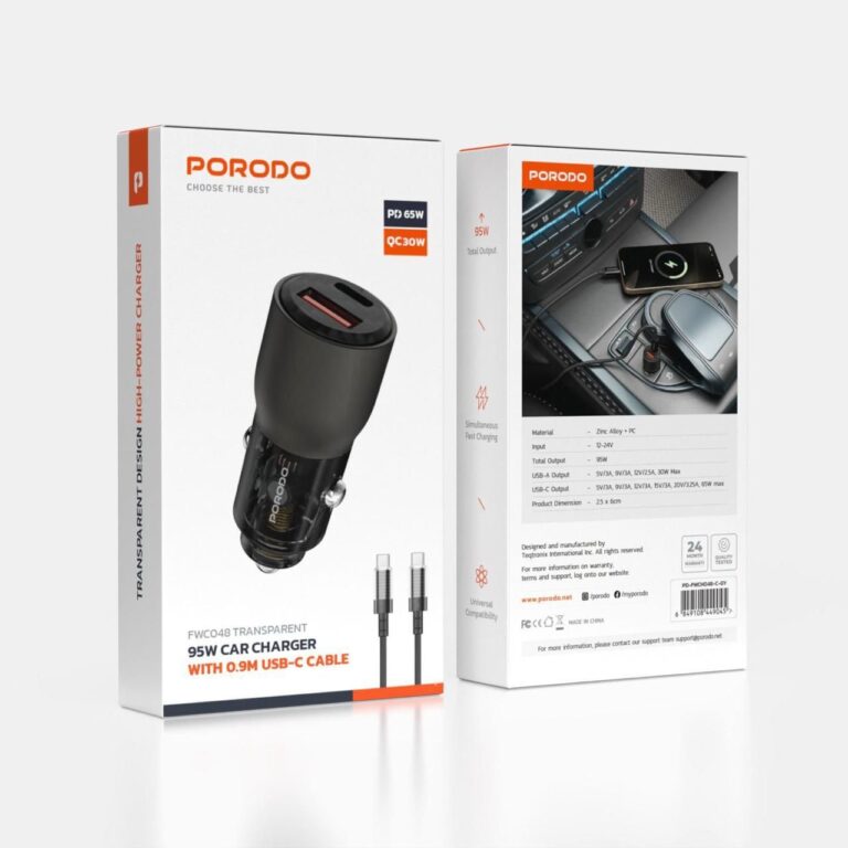 Porodo 95W Transparent Car Charger – Fast Charging with 0.9M USB-C Cable