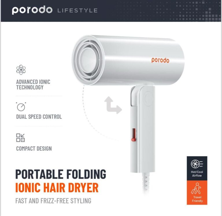 Porodo Lifestyle Portable Folding Ionic Hair Dryer Fast And Frizz-Free Styling-Sleek Frizz-Free Hair Anywhere -5,000,000 cm Ionic Capacity-1300-1500W Rated Power-1900RPM Speed Motor-75dB Noise Level