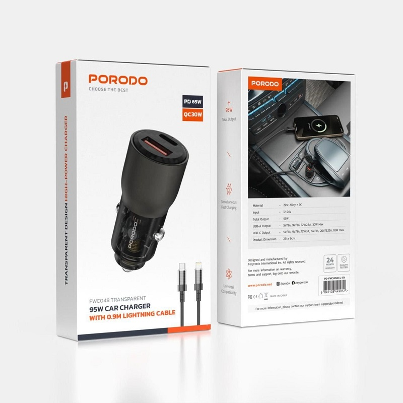 Porodo 95W Transparent Car Charger with USB-C Cable (0.9M) – Fast Charging Power Delivery