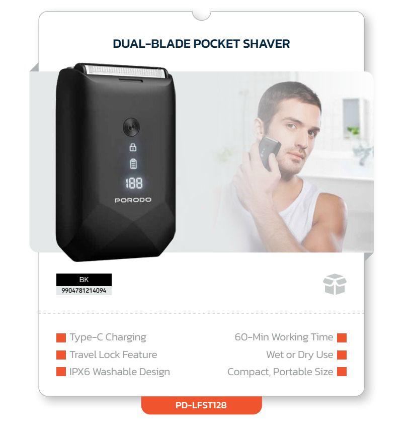 Safe and easy to use, the Porodo Dual-Blade Pocket Shaver is perfect for touch-ups, quick grooming, or maintaining facial hair, delivering professional-quality results wherever you are.