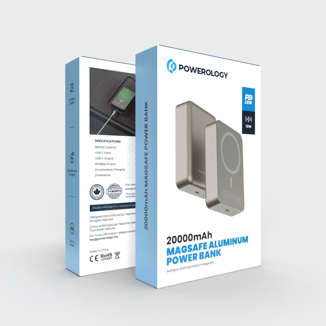 The Powerology 10000mAh MagSafe Aluminum Power Bank is a powerful and stylish portable charging solution designed for modern, on-the-go lifestyles. Featuring MagSafe compatibility, this power bank delivers up to 15W wireless fast charging, ensuring efficient and secure power delivery for compatible smartphones.