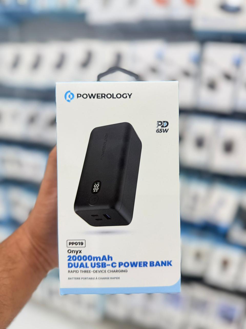 tay powered anywhere with the Powerology 20000mAh 65W Onyx Power Bank. With high-capacity 20000mAh battery and 65W fast charging, this power bank efficiently charges smartphones, tablets, laptops, and other USB-compatible devices—perfect for travel, work, or daily use.