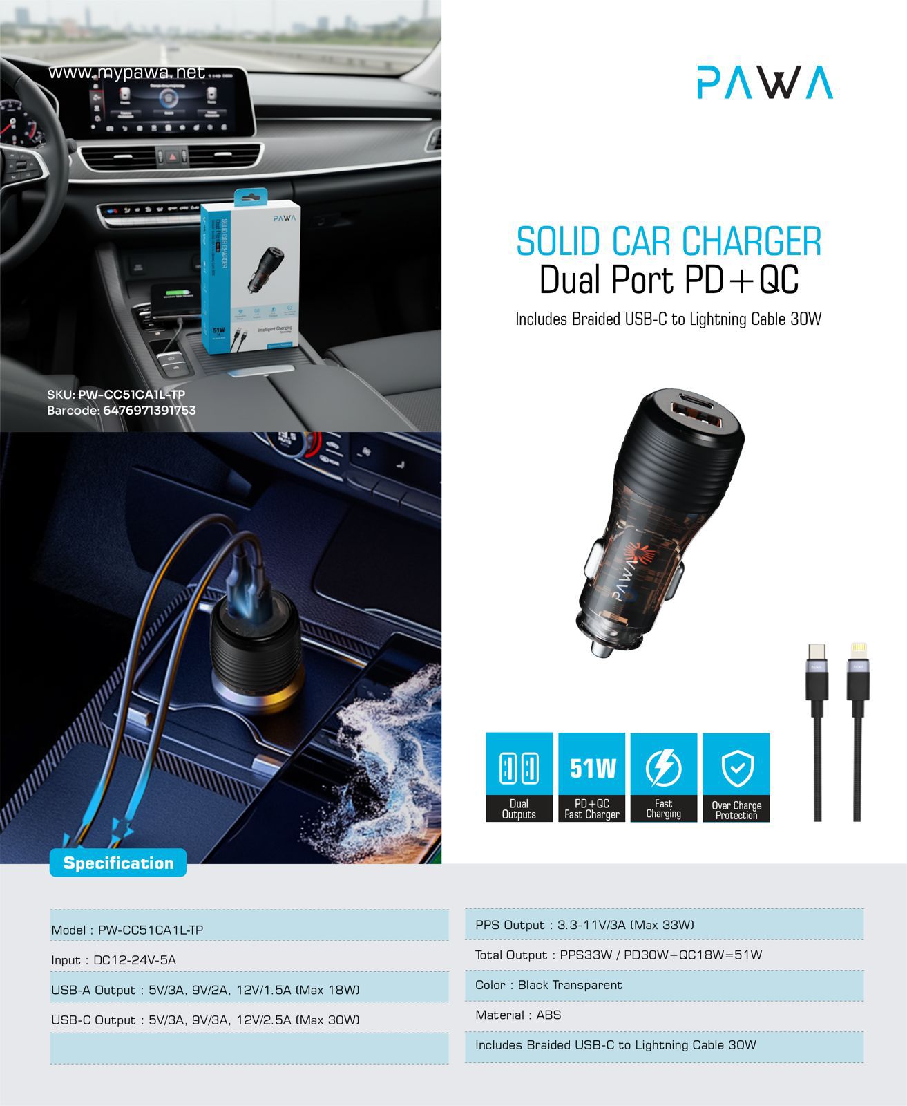 The Solid 60W Dual-Port Car Charger is engineered for fast, safe, and reliable charging on the go. Featuring PD (Power Delivery) and QC (Quick Charge) technology, it delivers high-speed power to smartphones, tablets, and other USB-C devices, keeping you connected during travel.